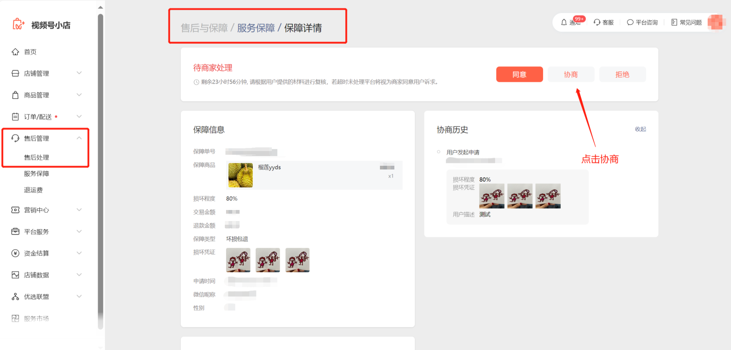 (2)路径二:售后管理 > 售后处理 > 保障处理 > 详情(跳转保障详情页面)> 协商