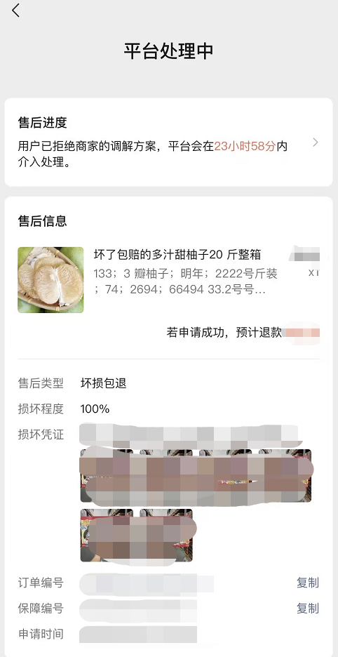 3.2 用户申请「坏损包退」时,还应当提供证明材料,包括但不限于:收到商品与快递面单的合照、商品损坏比例的图片、商品损坏部位的清晰图片等。证明材料示例图如下所示.