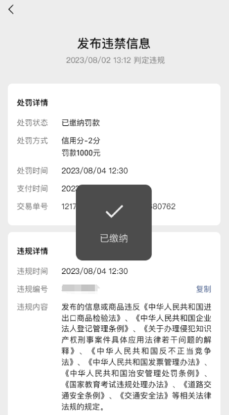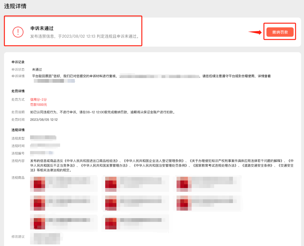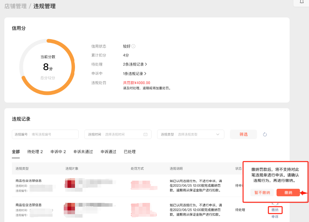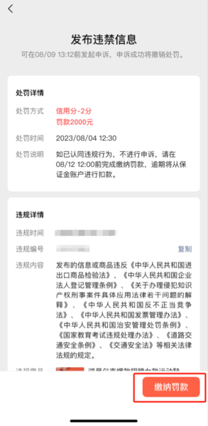(2)若商家认同违规行为,不进行申诉,直接缴纳罚款,罚款缴纳后不支持对违规进行申诉。