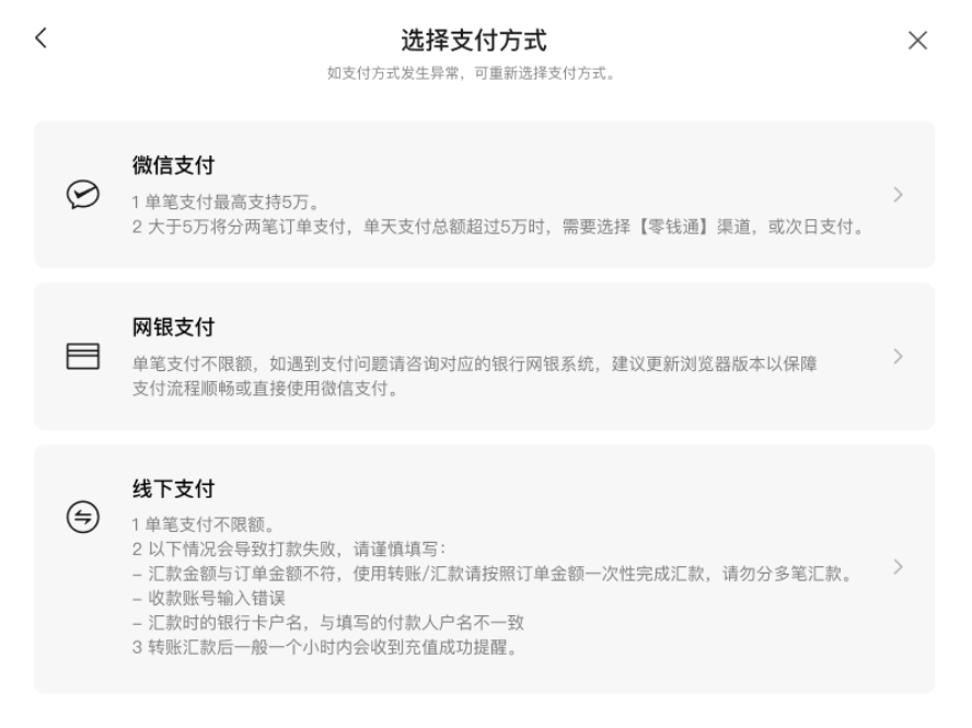 步骤二:选择支付方式,缴纳方式分为【微信支付】、【网银支付】、【线下支付】