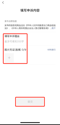在申诉期内,点击【申诉】即可前往申诉材料提交页面,发起申诉。