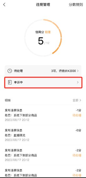 点击【申诉中】前往【违规明细】查看页,找到对应【违规记录】,选择【申诉进度】,即可查询申诉进度。