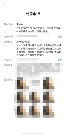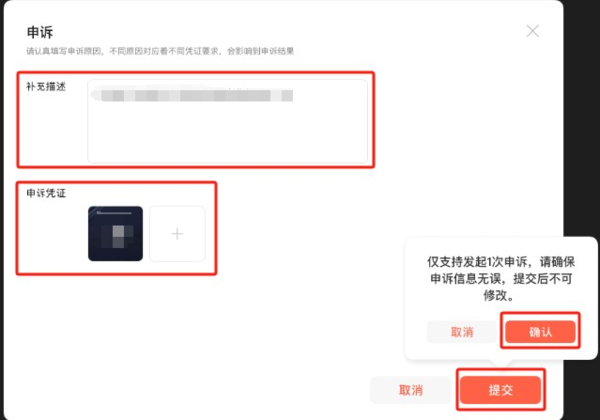 每条违规仅支持发起1次申诉,且提交后不可修改;请提交真实有效的申诉材料,谨慎对待。