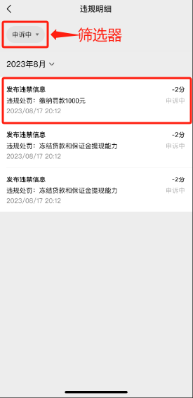 点击【待处理】【申诉中】【申诉未通过】【申诉通过】【已处理】可快速筛选对应状态的违规记录。