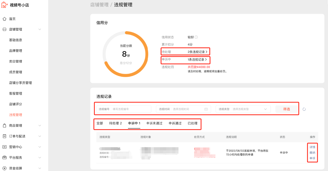 登录【视频号小店后台】-【店铺管理】-【违规管理】