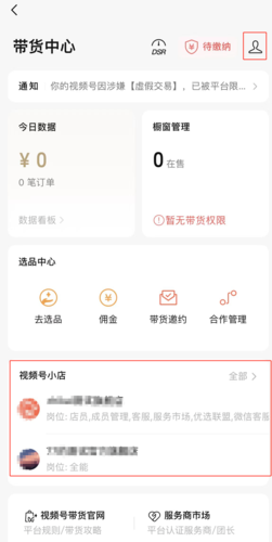 打开【视频号】-右上角【】图标-【创作者中心】-【带货中心】-【视频号小店】-右上角【】图标-【违规管理】