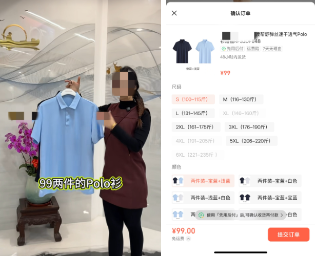 宣传polo衫99元两件,与对应商品价格一致。 | 直播画面展示电动车199元,实际售卖1799元。 |