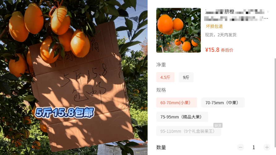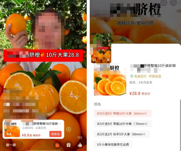 直播画面展示脐橙10斤大果28.8元,与对应规格商品价格一致。 | 画面展示大果宣传5斤15.8元,实际为小果4.5斤的价格,诱使用户误认为展示的大果为15.8元5斤。 |