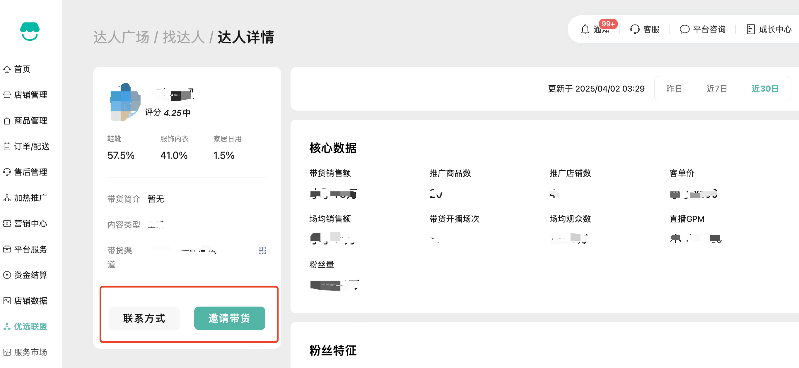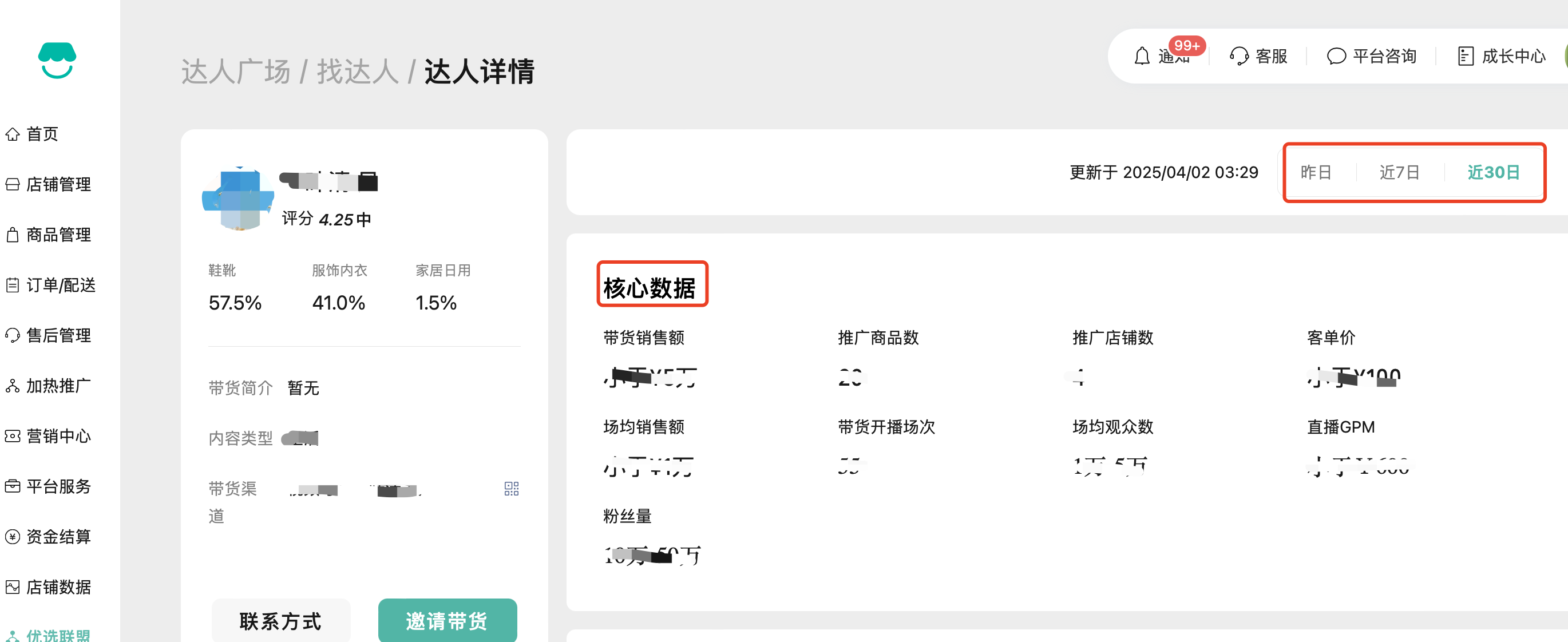 达人主页右侧展示达人带货相关数据,「核心数据」可筛选昨日、近7日、近30日数据,包括带货销售额、推广商品数、推广店铺数、客单价、场均销售额、带货开播场次、场均观众数、直播GPM、粉丝量