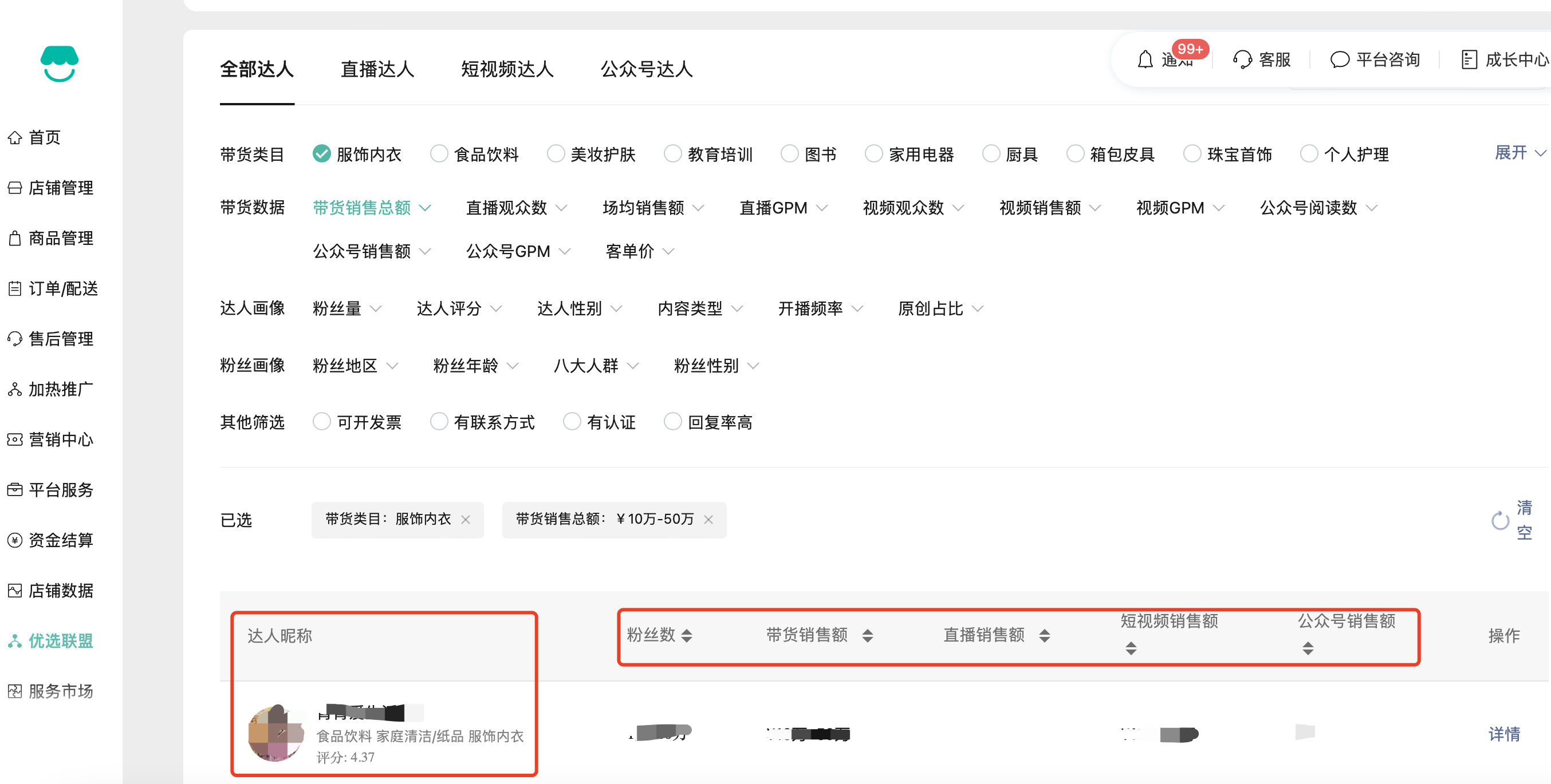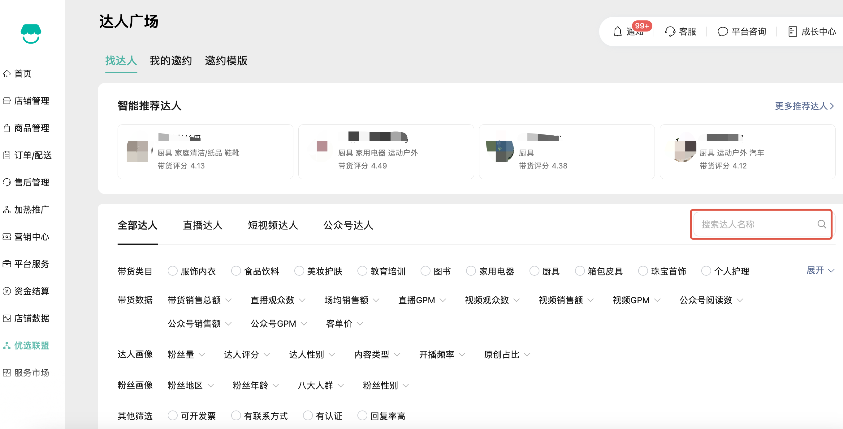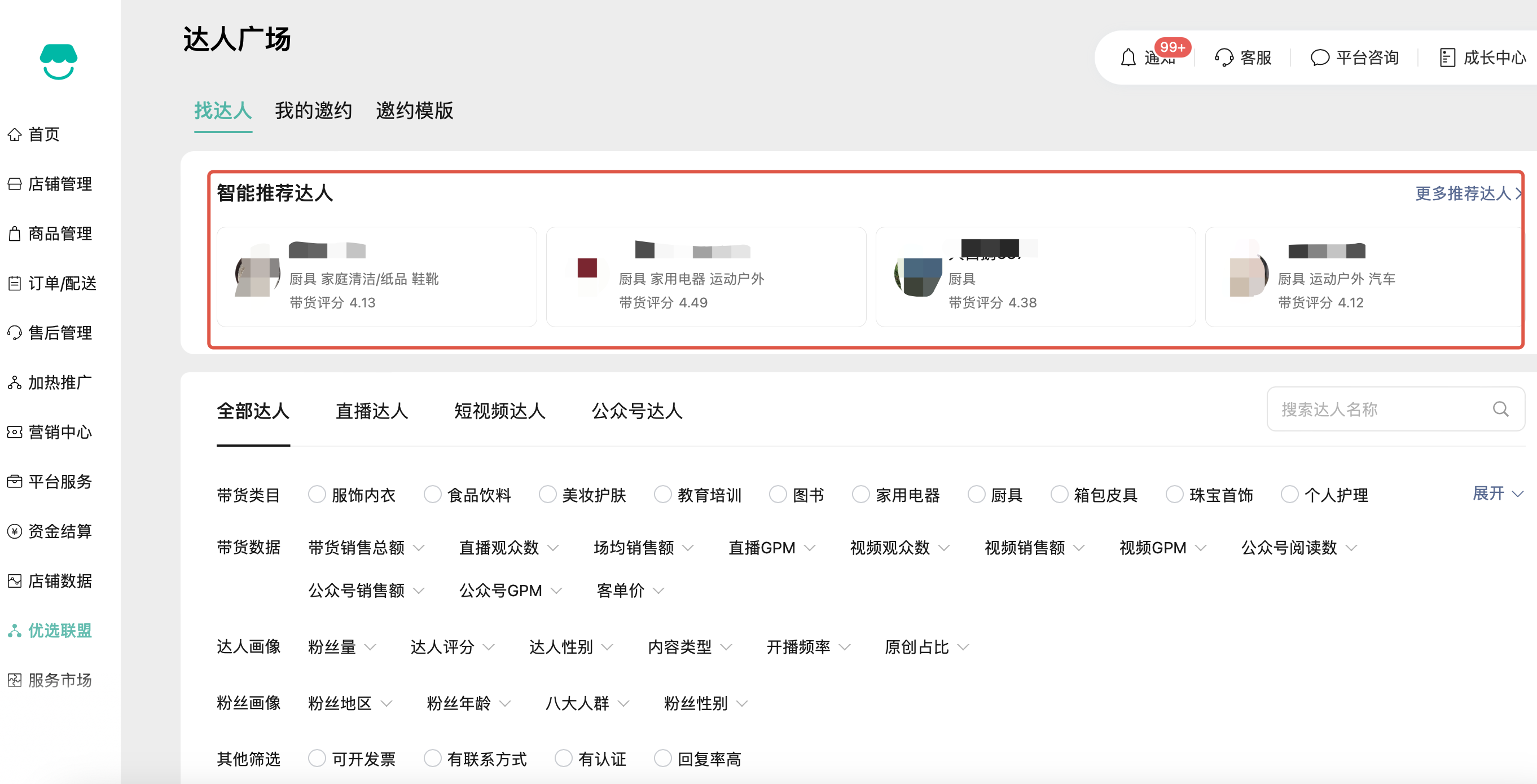 达人广场提供多个维度的筛选项,你可以定位达人类型「直播达人」、「短视频达人」、「公众号达人」或「全部达人」,也可基于「带货类目」、「带货数据」、「达人画像」、「粉丝画像」和「其他筛选」准确找到匹配达人