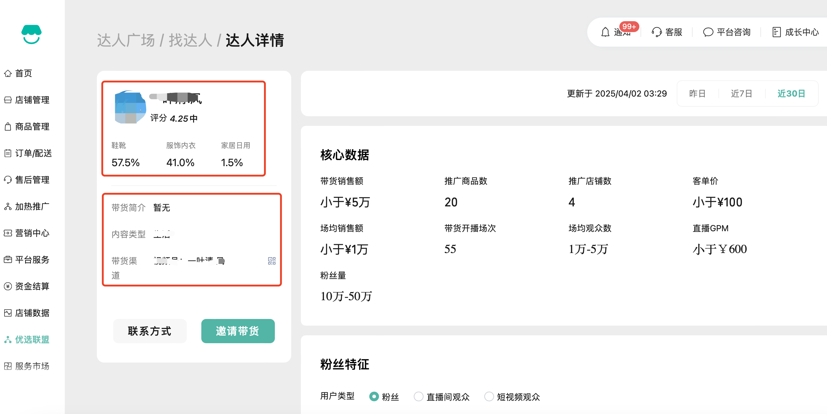 如果达人未对你开放联系方式的查看权限,你可以在达人主页「邀请带货」来联系达人