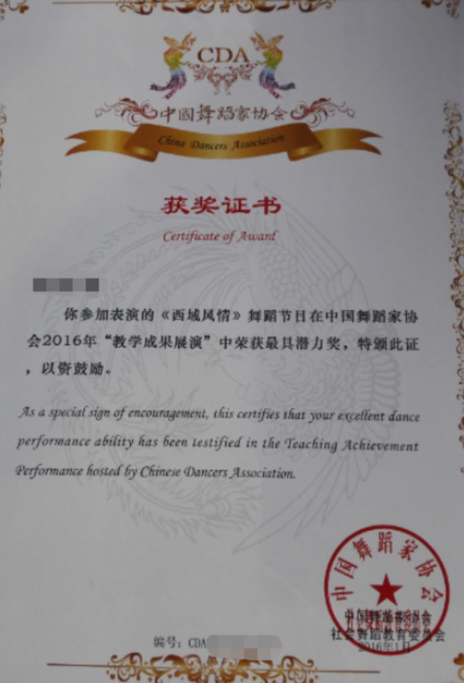 中国舞蹈家协会颁发的大赛获奖证书(前3名) | 可通过官网查询大赛获奖信息及证书 | ||||