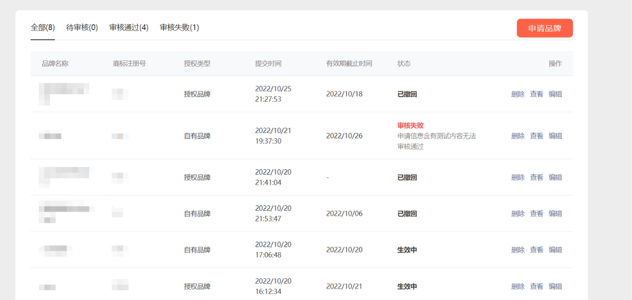 (2)如品牌资质显示【审核失败】,请查看原因后补全资质进行重新提交。