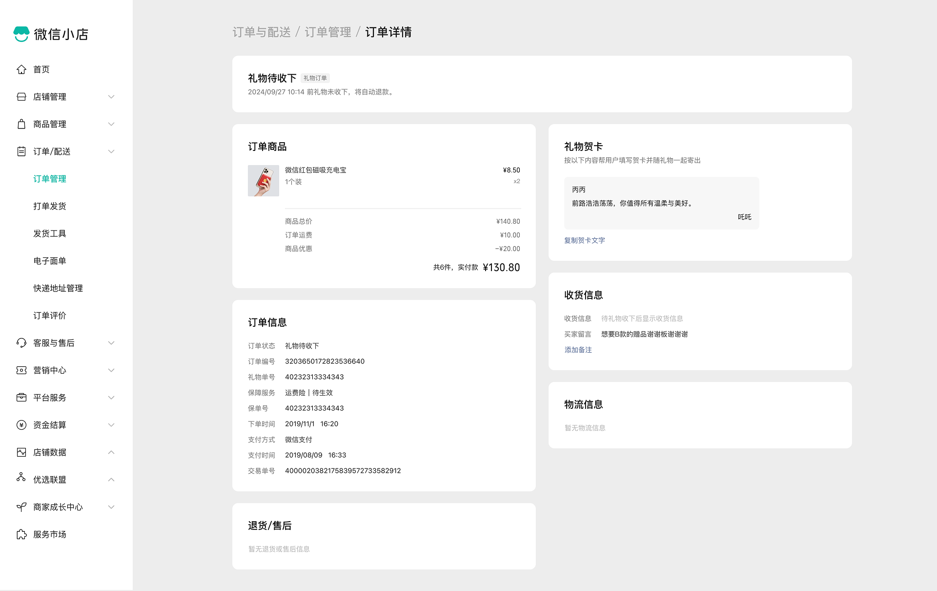 如果该笔订单用户填写了“礼物贺卡”,商家可以在「微信小店 > 订单/配送 > 订单管理」中查看礼物贺卡内容,具体如下: