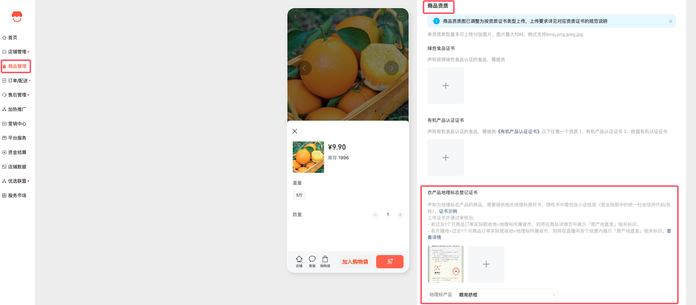 微信小店后台 -「商品详情配置页」设置相关地理标,「商品资质」模块中的「农产品地理标志登记证书」中,可上传商品所具备的地理标证书,并选择证书对应的地理标产品名。