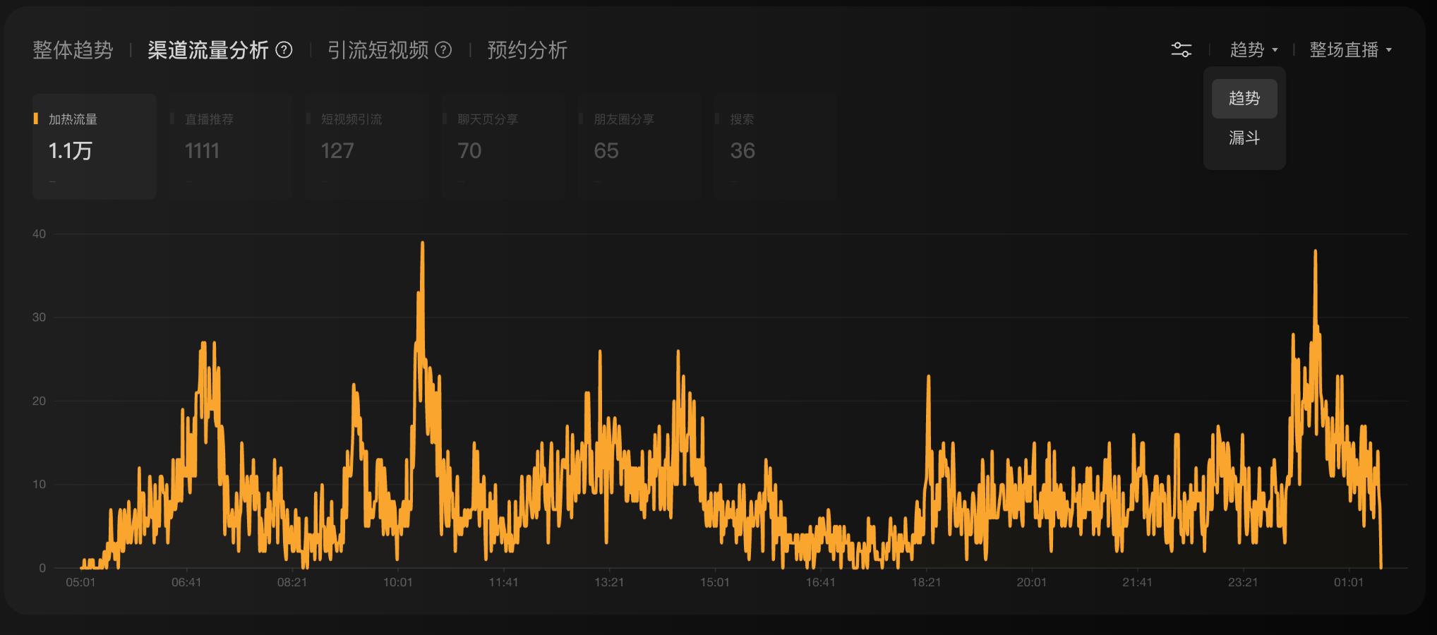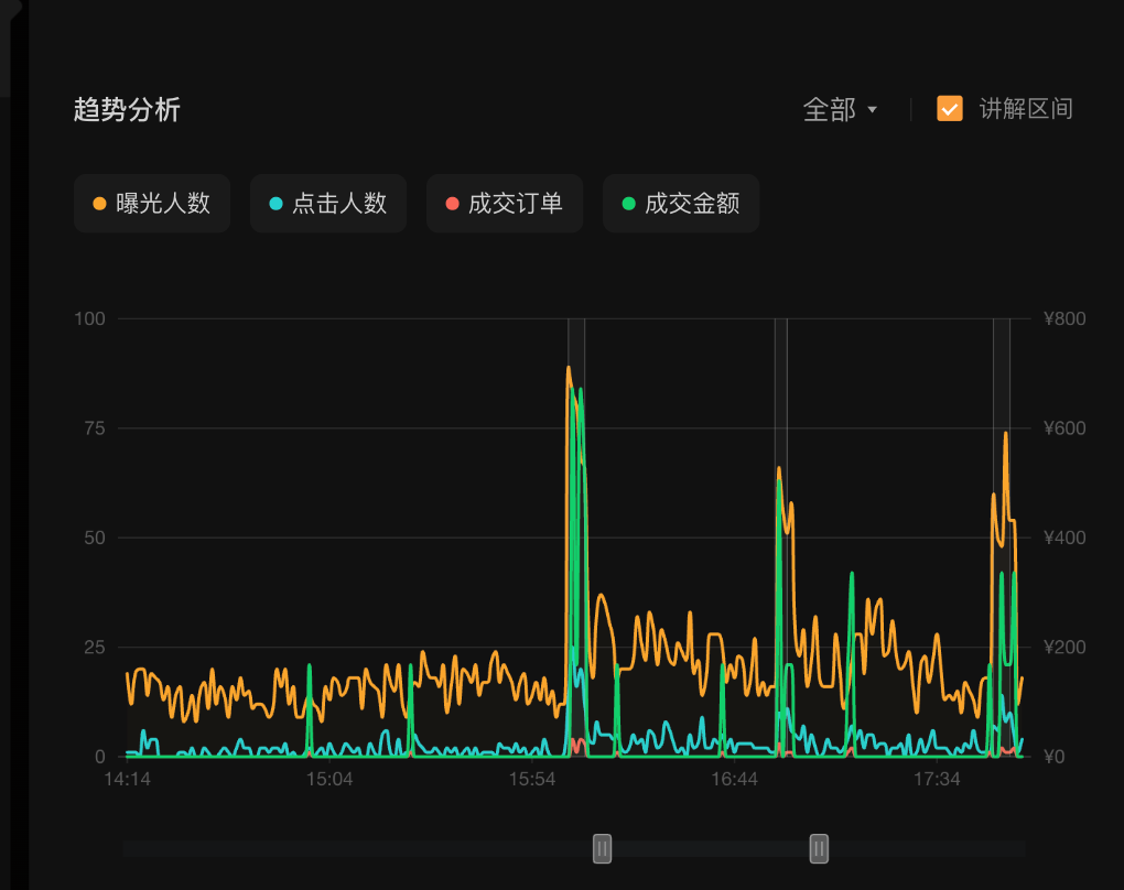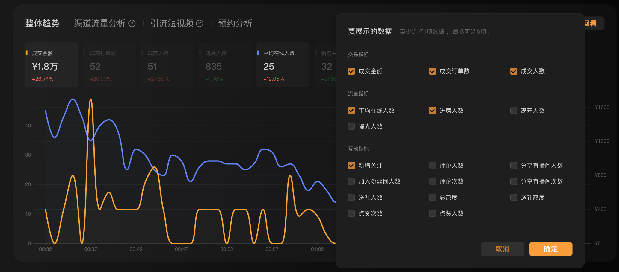 你可以通过整体趋势,来分析指标变化趋势,定位本场直播表现的问题时间段。你同样可以通过点击「配置」按钮切换你关注的指标,同样可以选择聚焦到某个时间段来详细分析。