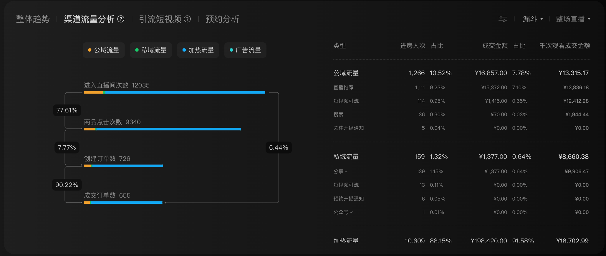 支持查看不同渠道的流量进房人次变化,以及转化漏斗,拆解不同渠道的用户购买力,运营效果。流量大类划分为:公域流量、私域流量、加热流量、广告流量。