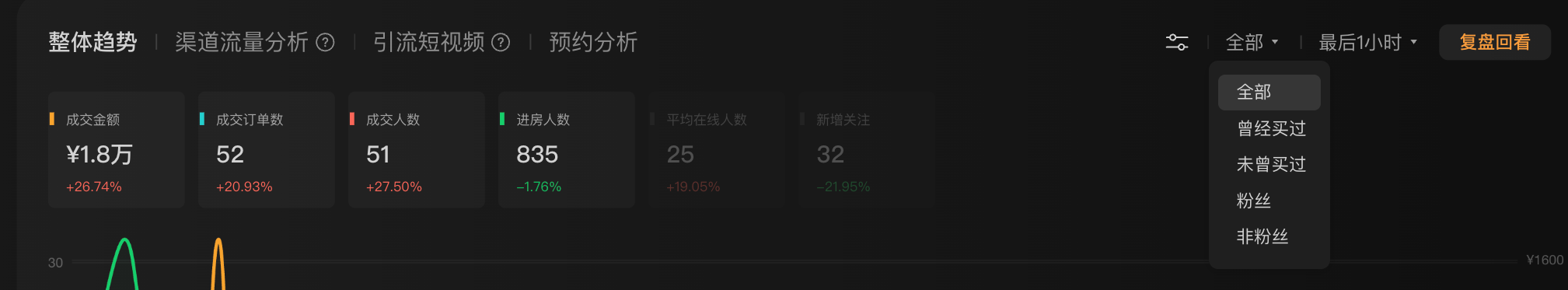 整体趋势支持区分人群来分析,分为:全部直播间观众、曾经买过的观众、未曾买过的观众、已成为粉丝的观众、非粉丝观众。