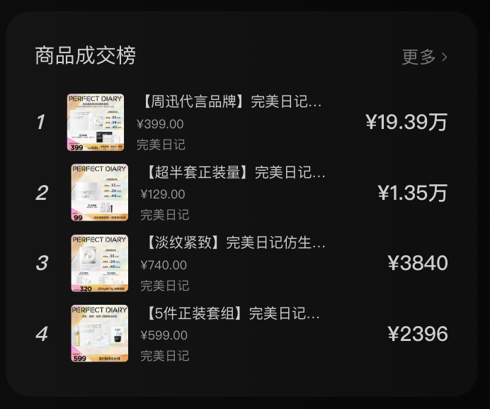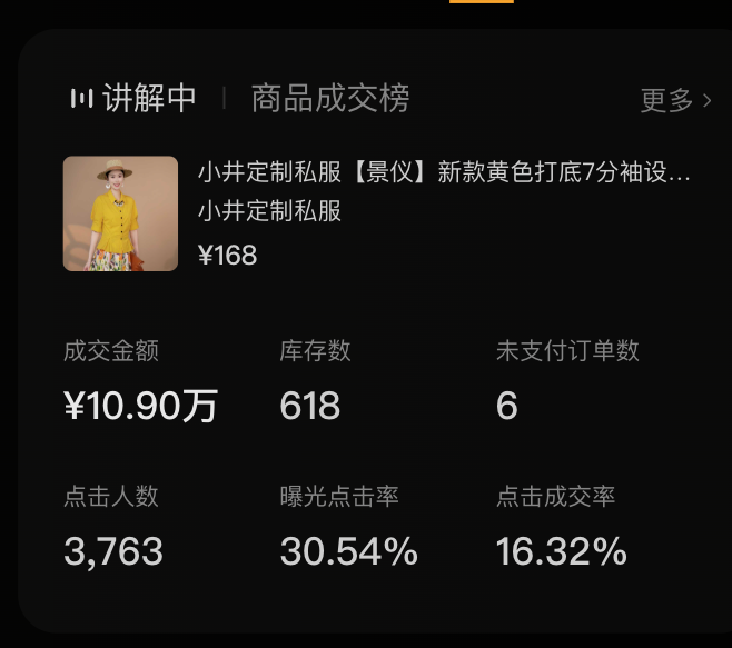 直播中时,主播可以在商品区域查看讲解中商品的实时流量、转化情况;直播结束后,主播可以看到商品按成交金额高到低的排名情况,点击「更多」将跳转到商品屏幕。