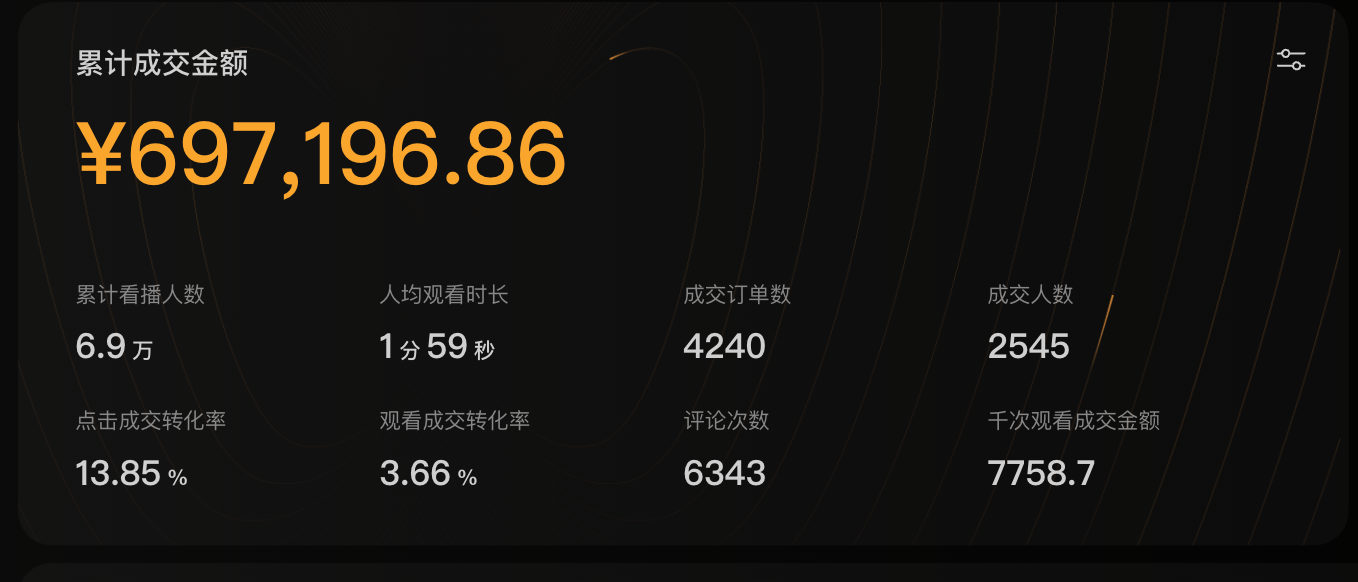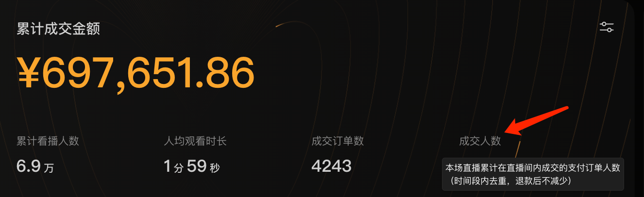 你可以在大屏左上角看到本场直播的核心数据,直播中数据秒级更新。
