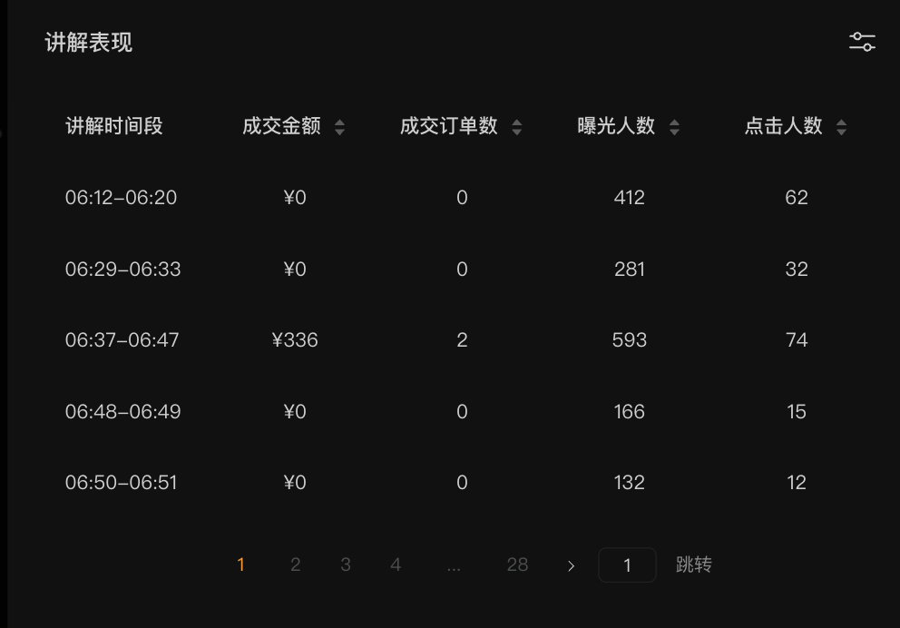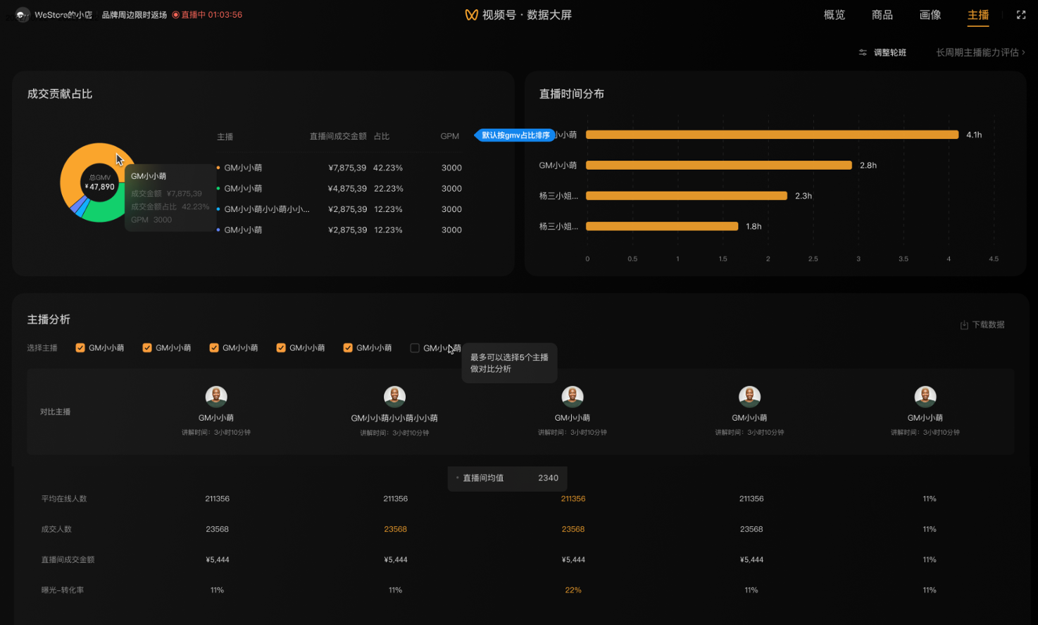 支持设置直播中不同主播直播的时间段,从而对比主播的直播效率