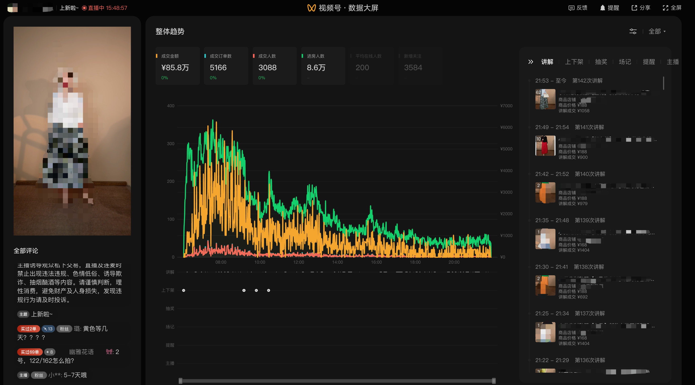 支持主播切换到具体的时间点,查看当时的数据变化、发生的事件、以及当时的视频流和评论,快速支持复盘能力。