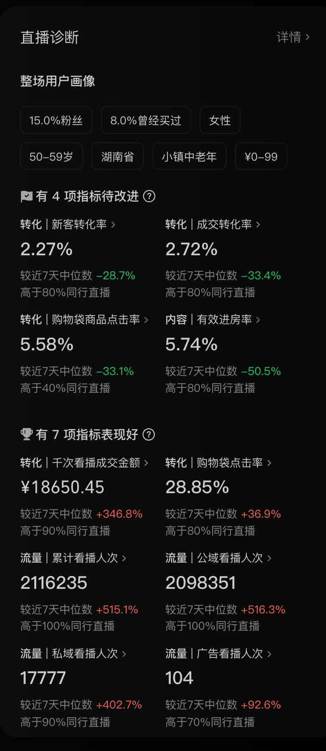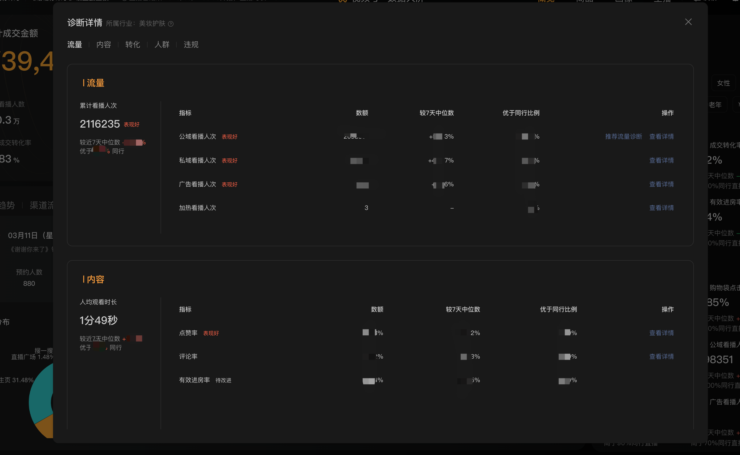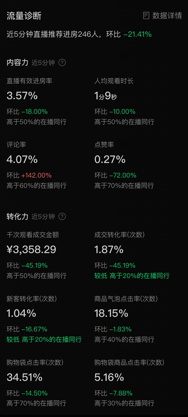 直播关播后的第二天,大屏将生成对这场直播间的诊断,包括流量、内容、转化等指标的自身近期变化对比,以及和当日开播的同行对比。