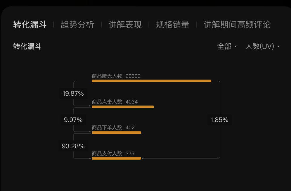 商品转化漏斗支持区分不同用户对商品的转化差异,支持筛选全部、曾经买过、未曾买过、粉丝、非粉丝,以及区分UV/PV两个维度查看漏斗。