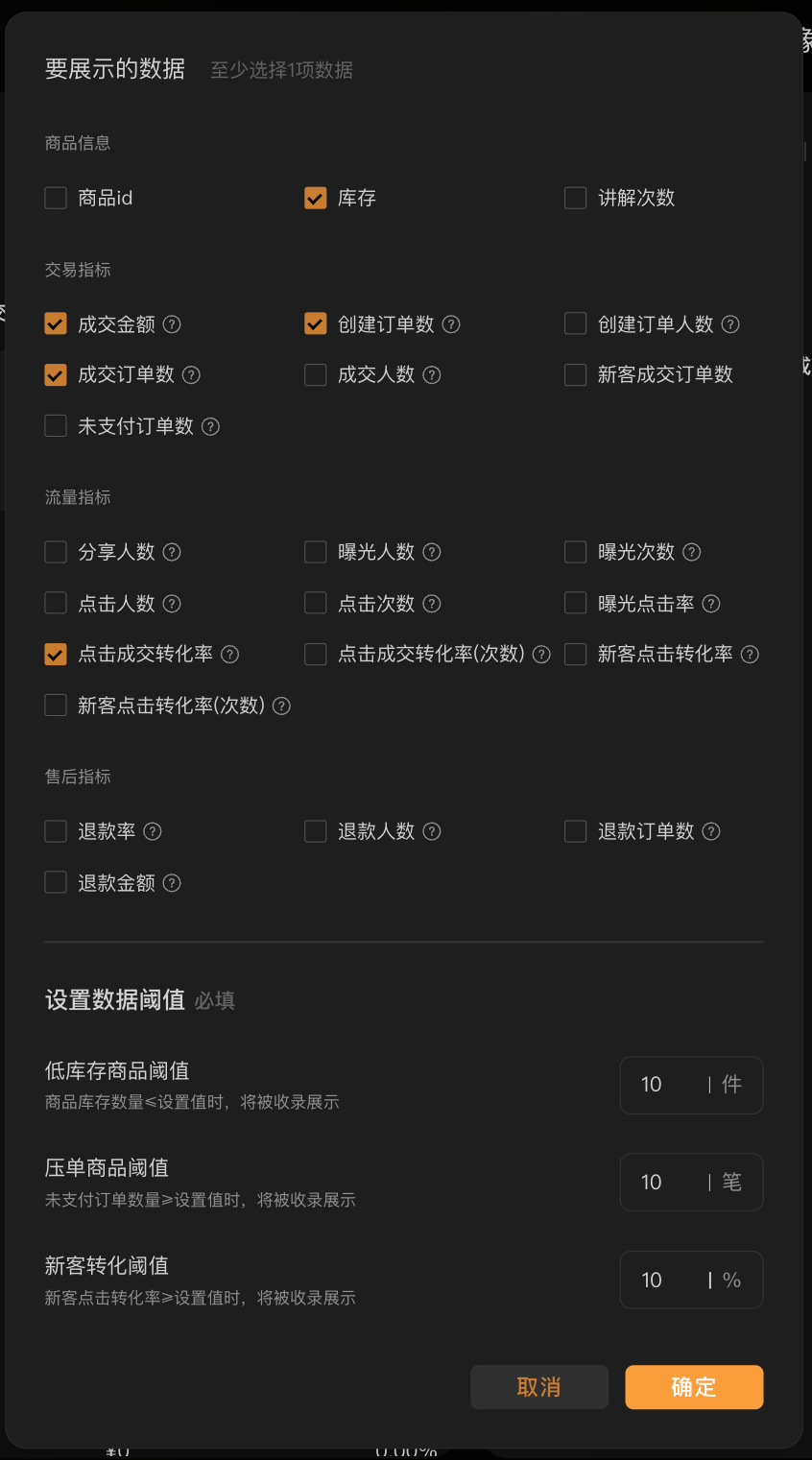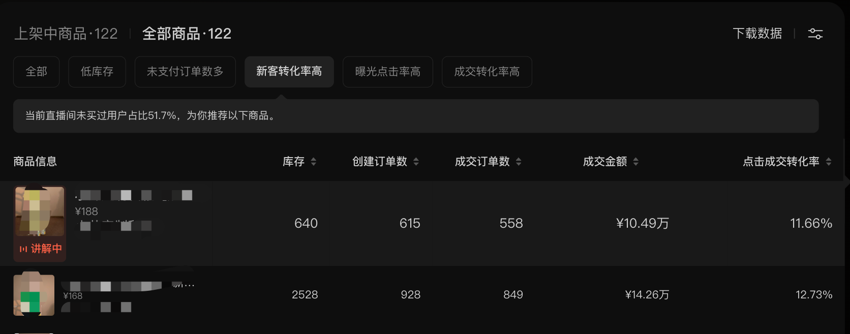 商品列表支持个性化选择自己关注指标来监测,同时支持按不同维度快速筛选需要的商品,例如通过新客转化率高来筛选爆品,承接公域的新客流量,来增加公域新用户推荐。