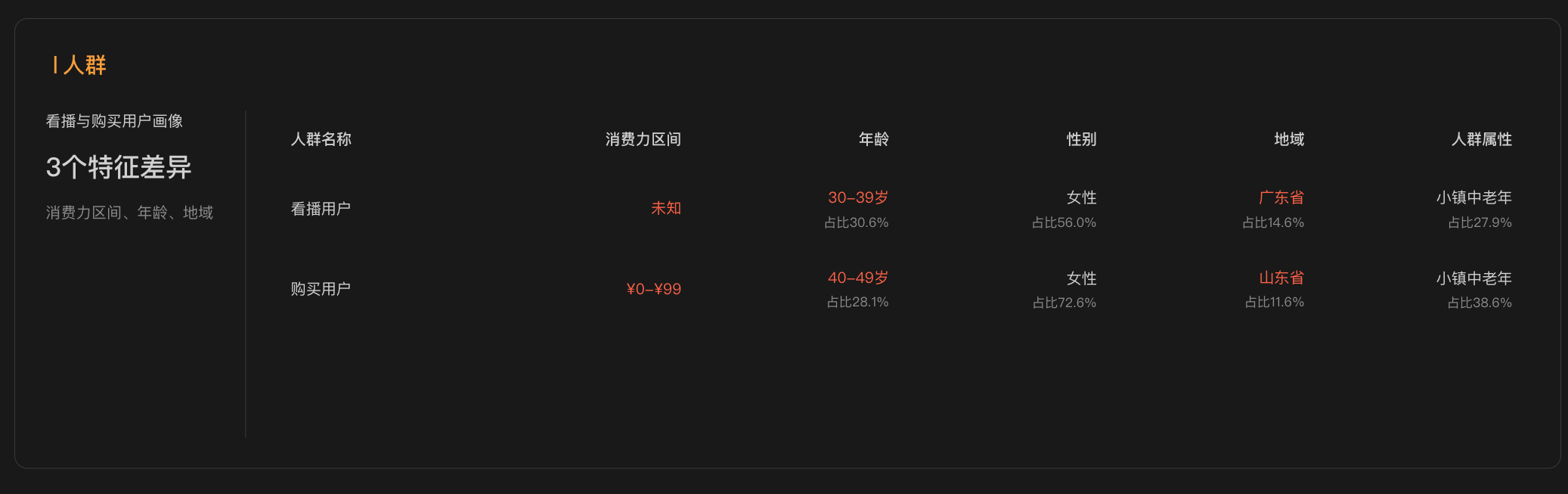 同时将看播和购买人群的差异为主播总结出来,帮助主播更好挑选合适直播间观众的商品。