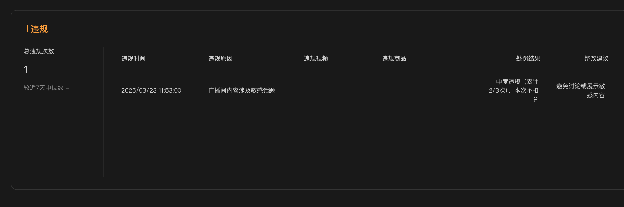 违规也是影响直播间流量的重要因素,大屏会将直播间违规的原因及处罚透传给主播。