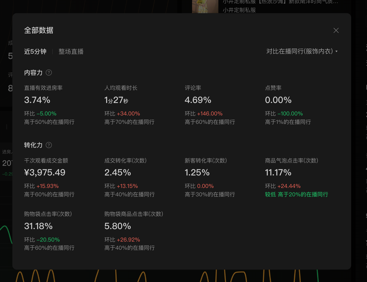 直播中支持通过内容力、转化力维度去查看自身公域流量的竞争力。可以切换到近 5分钟的数据和在播直播间比较,也可以比较整场直播间。同时为了主播更精准的对标,大屏提供了与同行对比或者大盘所有直播间对比的筛选切换。