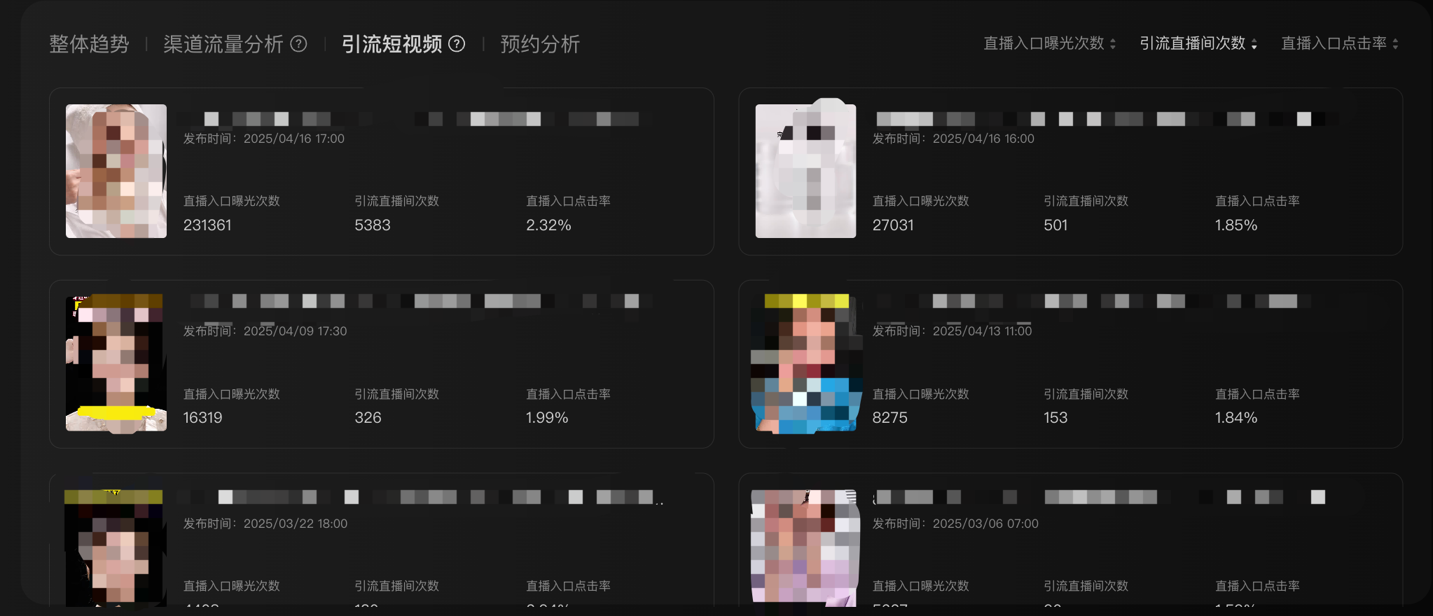 支持查看引流到本场直播间的短视频,通过引流直播间次数和直播入口点击率快速筛选高转化素材。