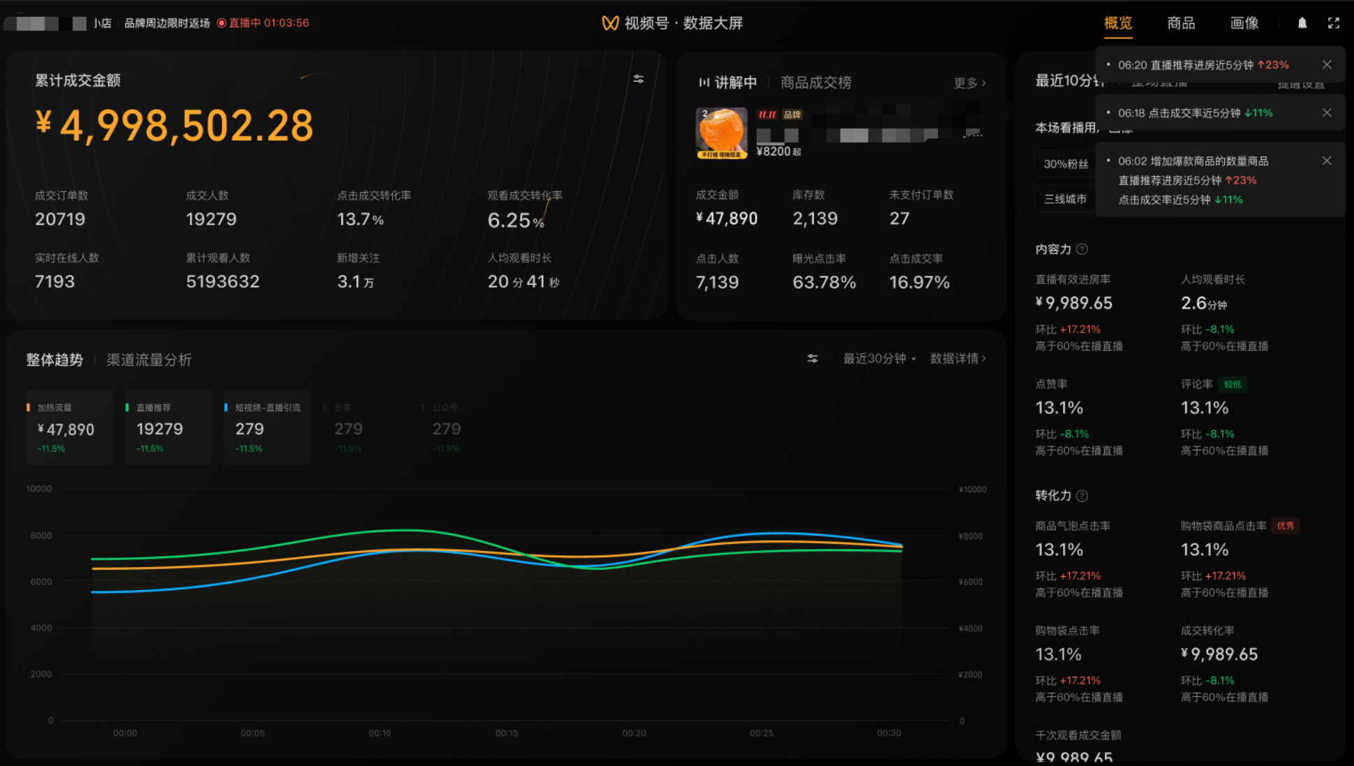 概览屏幕是直播所有流量、转化、互动数据监控的核心面板,主播团队可以在该屏幕总览各项数据的变化,并进一步下钻分析。