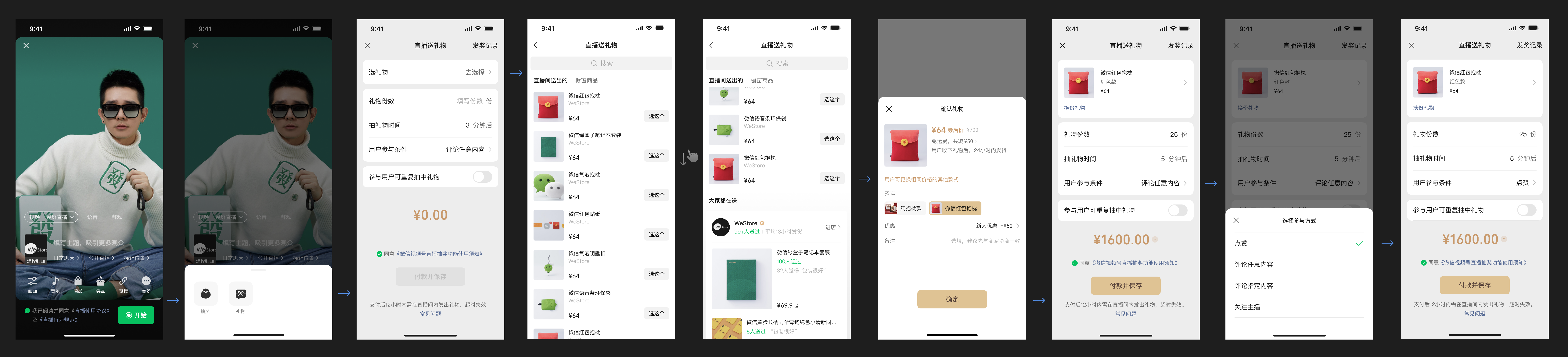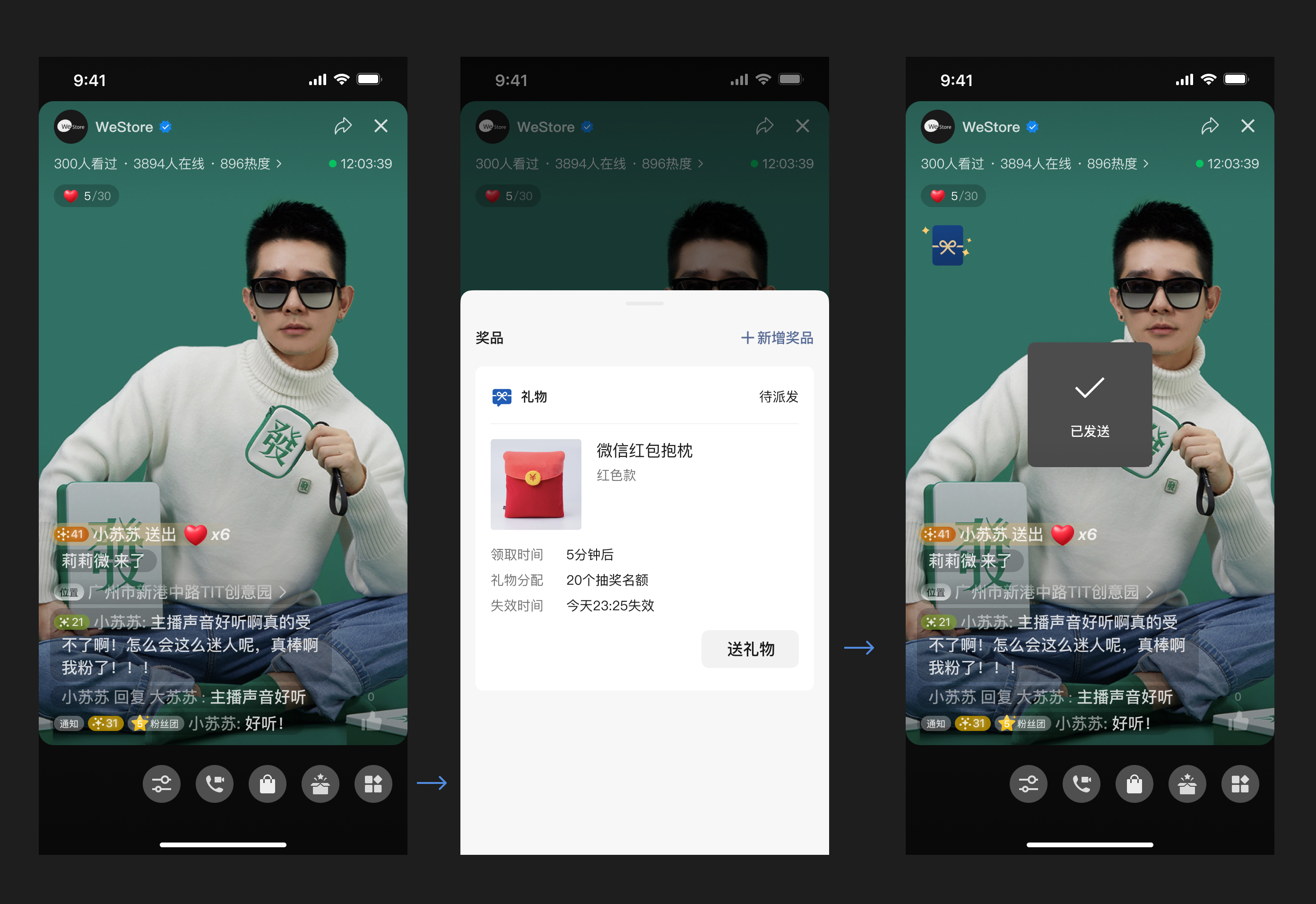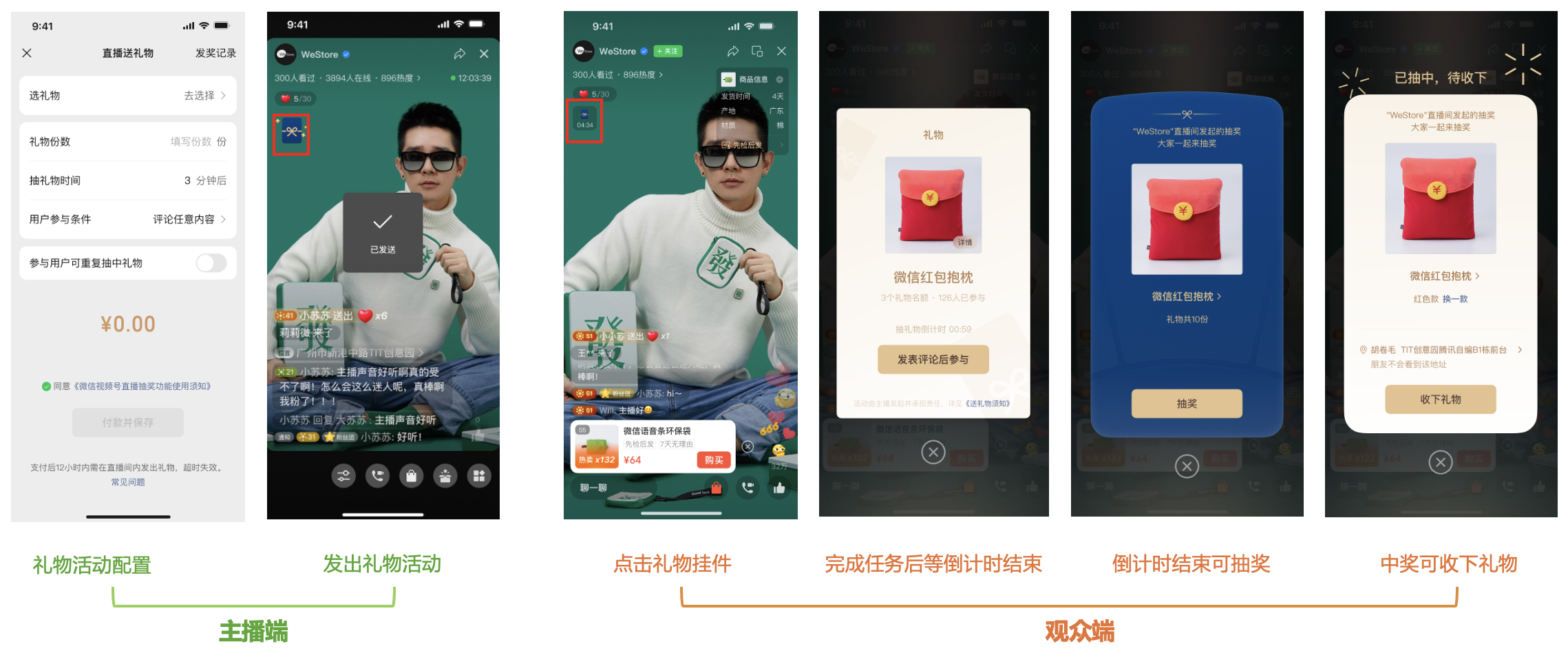 1. 所有的主播,都可以通过「大家都在送」模块、「搜索」能力,找到微信小店平台中的商品当礼物(单份礼物价值最高为1万元);若主播有电商身份,还可以直接在对应的tab快速找到相应商品——
